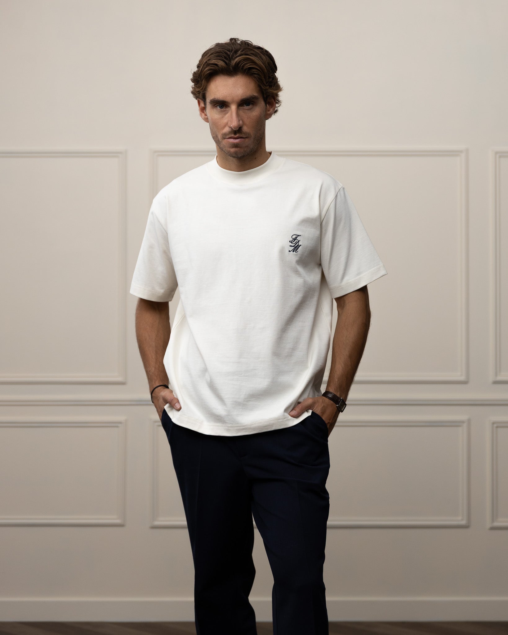 Afgewerkt met een geborduurd monogram op de voorkant, een nauwsluitende kraag en extra steken op de mouwen.