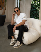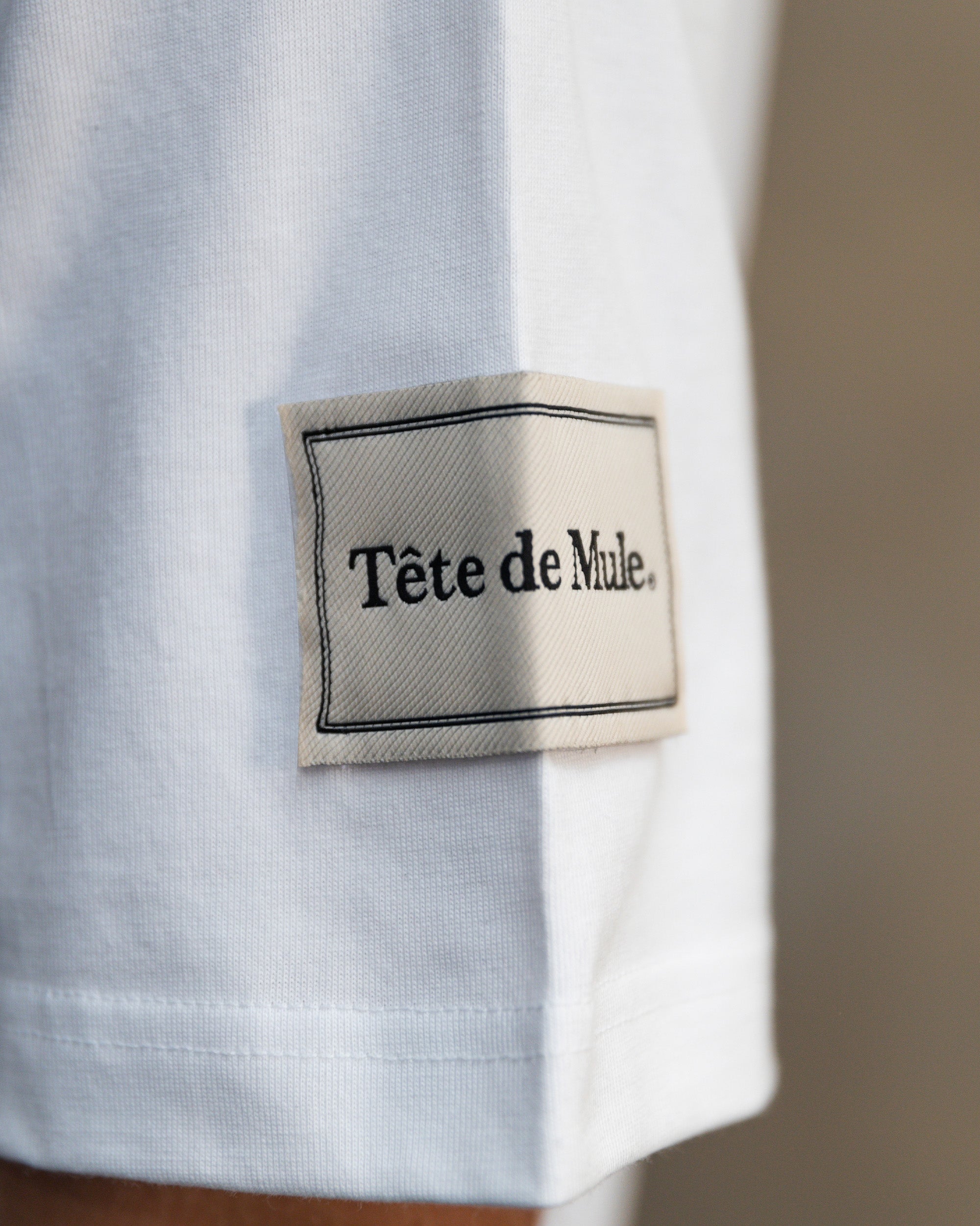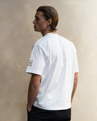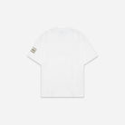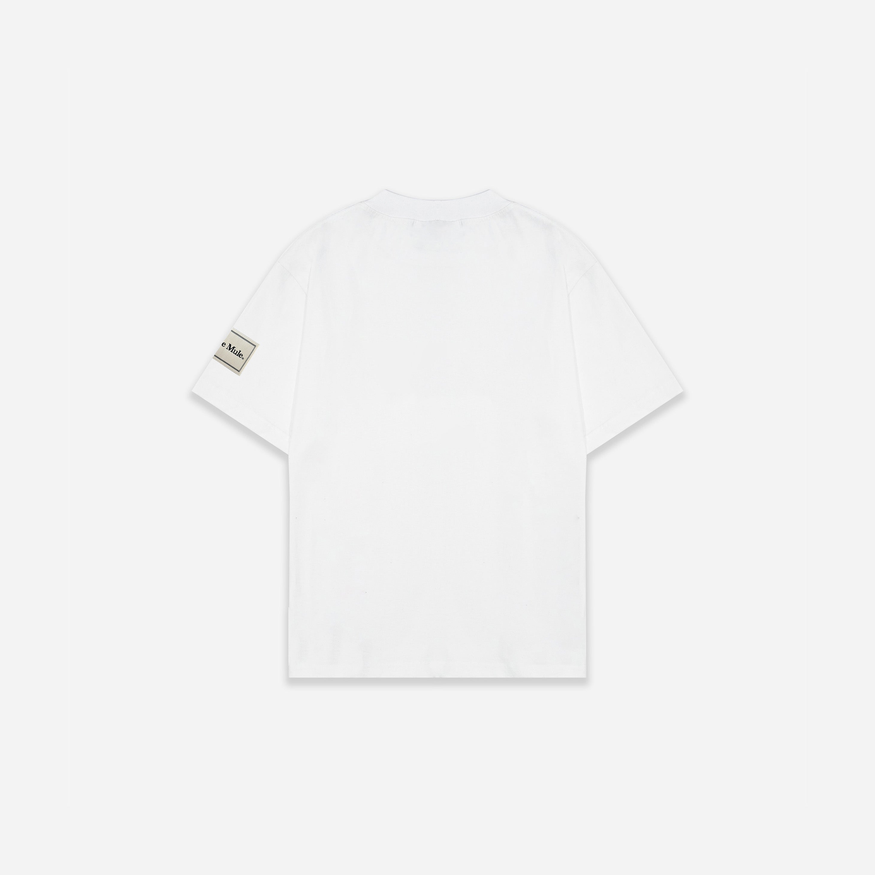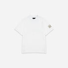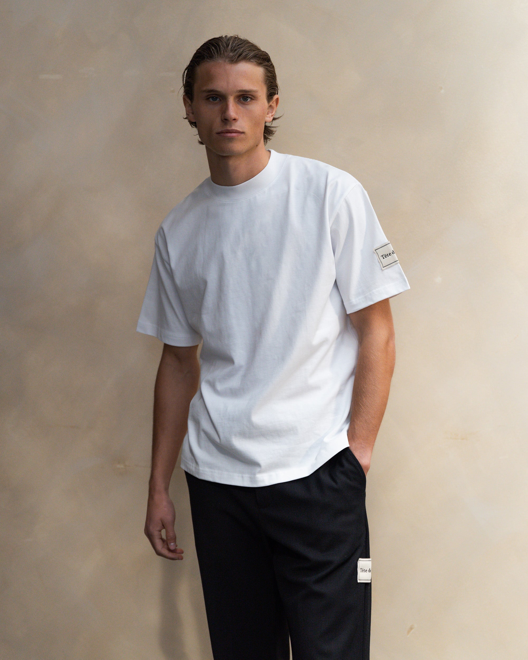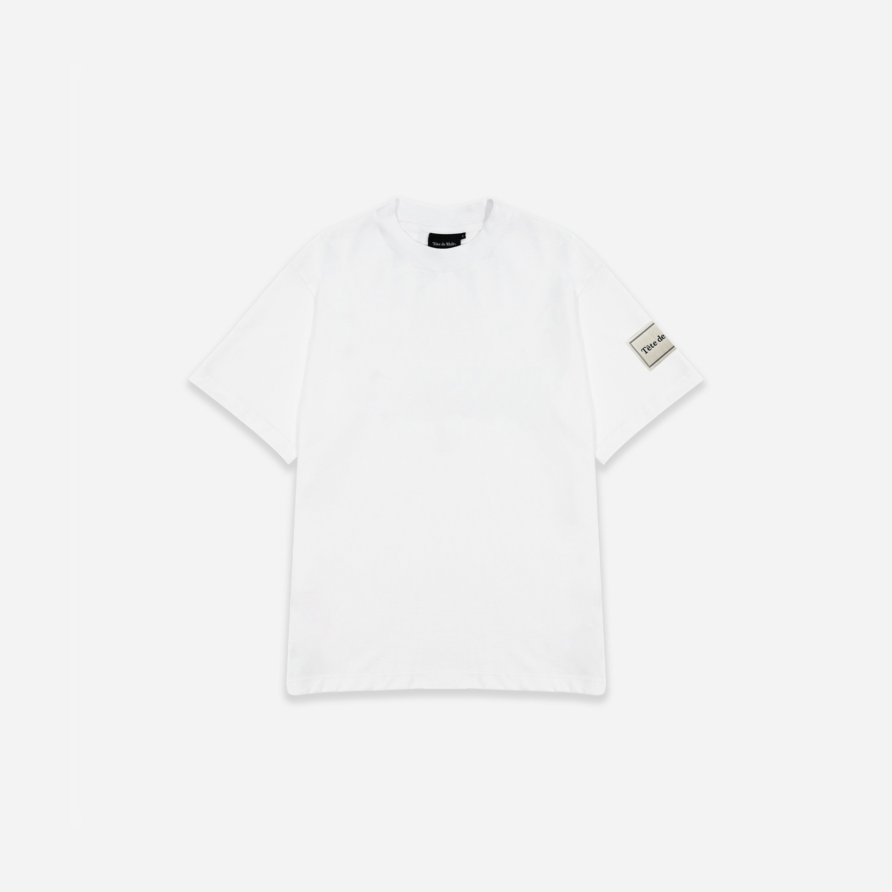 Slightly Oversized Fit Jersey Knit T-shirt with fine rib close-fitting round collar and a woven fabric patch attached on the left arm sleeve.